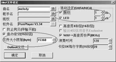 窗口中的文件大小限制是为了保证转换的MMF铃声文件大小不超过设定值,如果超过了,软件会提示文件超过指定大小,铃声文件会被中途截断。窗口右上方的振动和LED就是设定手机播放铃声过程中是否伴随振动和闪烁,在后面的通道一栏中选择主旋律的通道即可,最后点击确定。