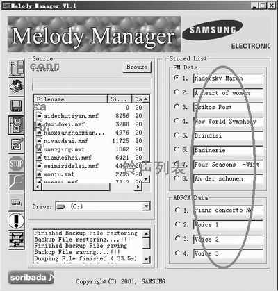 3.数据读取完毕,窗口右边的STORED LIST栏中分别列出了手机中的铃声的名字,分为FM DATA(8种)和ADPCM DATA(4种)两部分(图5),这个时候所有的按钮都变为彩色。