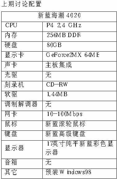 无名(神秘剑客):根据新蓝网站上的介绍,新蓝这款海潮4020电脑是一款商务用机,在营销上有它独特的定位,因此在配置上的策略必然与上一期的家用电脑配置不同,在配置中尤其突出了高主频的CPU和容量达80GB的硬盘。还配备了CD-RW这一偏重商务功能的硬件,从而显示了新蓝公司的独具匠心。比如CPU,目前市场上的P4 2.4GHz与P4 2.0GHz的差价不足100元,而这400MHz的主频差别带给用户的感觉是巨大的──尤其是像我等至今仍然用着PⅡ 450Hz的“穷人”来说。