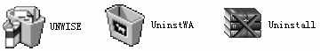 一个软件在安装完成后要进行删除,并不是直接利用咱们鼠标的右键菜单命令“删除”来进行的,一个软件要进行正确删除(尽量做到不在系统中留一点痕迹,或少留一点痕迹),我们常需利用卸载程序进行(正如把装好的货物卸掉一样)。常用的方法有这两种:一是利用软件自提供的卸载程序;二是利用控制面板中的“添加/删除程序”工具进行。如果采用软件自提供的卸载程序,对于咱们初学者来说,怎样才能识别哪个为卸载程序呢?其实很简单,下面咱们来注意观察几个卸载程序的图标及名称(如图1),从中各位发现什么规律了没?首先大家看这个图标,一、二两个是不是像桌面上的回收站标志(哈哈,其实也就是个垃圾桶),而第三个图标中有一个“×”的标志,是不是都有一种垃圾被倒掉或叉掉的感觉;接下来再看它们的名称,都以“UN”(不分大小写)开头,咱们只要在安装的程序目录中找到这样类似的程序,那么恭喜你,这个卸载程序已被你找到了。