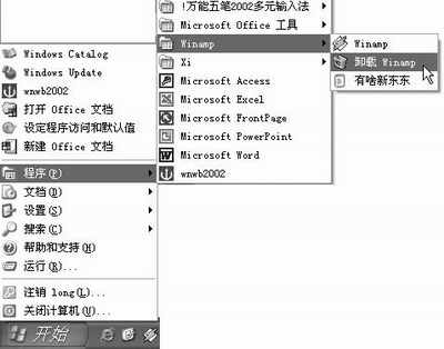 当然对于卸载程序咱们还有更轻松的方法,像大多数应用软件在安装完成后会在启动菜单中产生一个快捷菜单,咱们可选择该对应菜单中具有“删除”或“卸载”字眼的命令即可。若咱们要卸载一个Winamp播放器,可单击“开始→程序→Winamp”,在其下选择“卸载 Winamp”命令(如图2),之后的操作按其提示进行即可。而对于控制面板中的“添加/删除程序”,它的作用可大呢,它不但能够添加或删除应用程序,同时还可添加或删除Windows的组件。