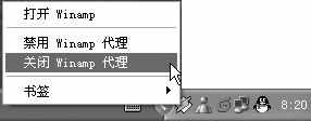 对于软件自带的卸载程序我们可按照上面的方法,在安装目录中查找卸载程序或在启动菜单中找到卸载程序快捷命令。比如咱们要把已安装的Winamp2.81汉化版进行删除(原安装目录为“C:\Program Files\Winamp”),首先要关闭已运行的Winamp软件,特别是对于一些开机自动运行的软件我们要进行关闭。关闭的常用方法是通过系统托盘中的运行图标打开关闭菜单,像Winamp咱们可先在系统托盘中找到该图标,在其上单击鼠标右键选择“禁用Winamp代理”或“关闭Winamp代理”进行关闭(如图3)。