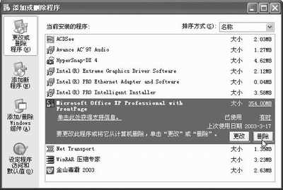 首先进入控制面板运行“添加/删除程序”,再在添加或删除程序窗右栏选择“Microsoft Office XP…”,并单击“删除”钮(如图6),
