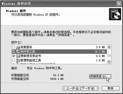 同样先进行“添加/删除程序”,并在窗口右栏中选择“添加/删除Windows组件(A)”选项,稍等一会儿后便可打开“Windows组件向导”窗,拖动组件选项右侧的滚动条选择“附件和工具”项,并单击选项下端的“详细信息”钮(如图7),