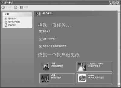 设置用户账户之前我们得先搞清楚Windows XP有几种账户类型,其实很简单,用户账户也就三种:计算机管理员账户和受限制账户,另外一种就是给在计算机上没有账户的用户使用的来宾账户,它相当于给没有本地户口的用户发一个暂住证。