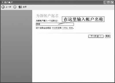 选择“开始”菜单中的“控制面板”,然后双击“控制面板”中的“用户账户”图标,打开“用户账户”设置窗口(图1)。单击“创建一个新账户”,然后在“为新账户起名”页(图2)中输入新用户账户的名称后单击“下一步”,接下来在“挑选一个账户类型”页(图3)中设置账户类型,如果已经有了计算机管理员账户,那就将新账户设置为受限账户,免得管理员多了打架。最后点击“创建账户”完成创建新用户的步骤。