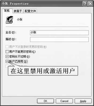 如果并不想删除某个用户而只是想暂时禁用它,用“控制面板”中“用户账户”就不起作用了,因为它只能删除用户账户而不能禁用它。用户账户的禁用与激活只能另辟蹊径。