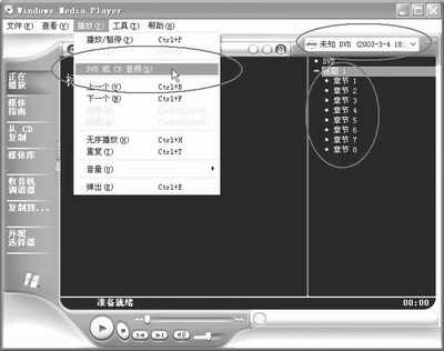 启动Windows Media Player,在播放列表选择列表中,单击要播放的DVD,或者在“播放”菜单上,单击“DVD或CD音频”命令,另外,也可以在“播放列表”窗格中,单击DVD标题或章节直接选择播放。
