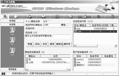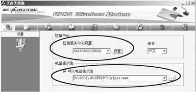 而对方回复短信后,软件会自动提醒你收到了新的短信,并会将信息内容显示在主界面上方的对话框中。值得一提的是,我们还可以进行短消息群发,当然前提是要设置“组群短信通信录”。另外,要能够发出短信,我们需要在“设置”标签页中设置SIM卡所属的服务供应商(中国移动或中国联通)的短消息中心号码。例如重庆移动的SIM卡要设置的短消息中心号码为“+8613800230500”(图6)。