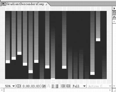 6.制作一个720×486pixels的Composition,命名为Gradient Descenders Comp,然后拖拉先前做的GRADIENT DESCENDERS1-GRADIENT DESCENDERS4到这个Composition来,并设置Position的关键帧(Keyframe),使他们从上向下移动,使复制该动作多一些,同时调整时间的长短来让速度有快有慢(图3)。