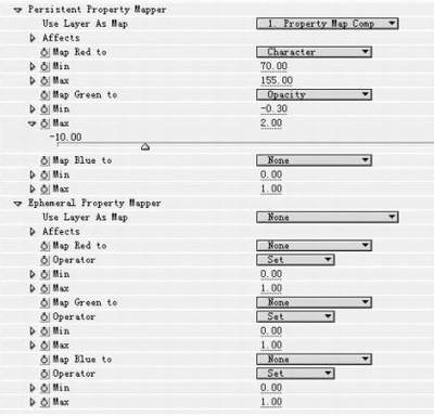 10.制作一个新的720×486Composition命名为Property Map Comp,拖拉先前做好的Random Noise Comp与Gradient Descenders Comp过来,把这两段Composition的眼睛隐藏,然后新增一层白色色层,命名为Set Channel Layer 。在此层中加入Set Channerls特效,点菜单“Effect→Channel→Set Channerls”。在特效控制窗口修改如下参数。这时完成的影片应该是背景有红色、黑色杂点而绿色色块与色条渐层从上向下缓缓下降。