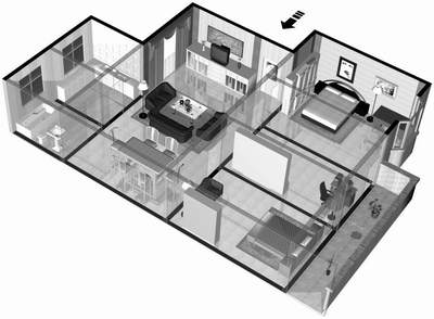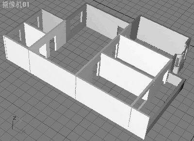 在最后的透视效果图中,实体墙顶部和虚体墙底部一般需要标注成黑色,虚体墙的顶部标注成半透明的灰色,整个效果图的背景以白色显示,在房门的顶部绘出一个箭头,作为进入住房的指示。作为后期处理的这些工作也可以在Photoshop中完成,这里我们还是选择在3DS MAX中进行。