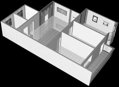 绘制截面并放样生成主卧室的飘窗和阳台。根据观察角度将所有的墙体分为实体墙和虚体墙(实体墙不对房间内的物品遮挡,可以进行精确的效果装修;虚体墙影响到观察视线,所以只进行透明化和线条处理),并对实、虚体墙暂时指定不同的两种颜色,以便于下一步的设计。用布尔运算切割出户型图中指定的门窗位置(图4)。