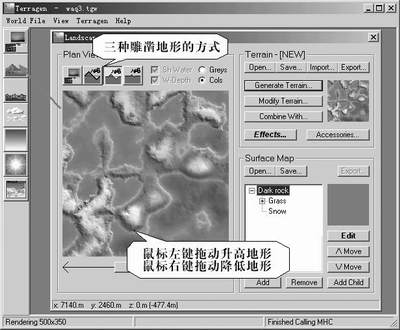 打开“Landscape(风景)”窗口(图2),按下“Generate Terrain(生成地形)”按钮弹出“Terrain Genesis(地形生成)”子窗口,在这里对生成的地形参数进行必要的调整,再次按下此窗口的“Generate Terrain(生成地形)”按钮即可随机产生一个山脉地形。地形的示意图则出现在窗口里。