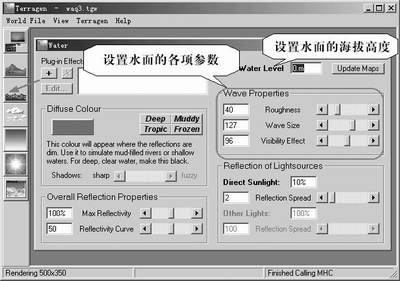 湖泊水面的海拔高度设置为0M,在水面的“Wave Properties(波浪属性)”窗口里,分别对粗糙度、波浪效果和可见度等参数进行调整。最后,我们在左下角的Overall Reflection Properties(反射属性)”窗口,对最大反射率和反射曲线做进一步设置,前者是指整个水面的反射亮度,后者是指主要反射光区的亮度和范围。调整完之后,按下窗口右上角的“Upbate Maps(修改图像)”结束。