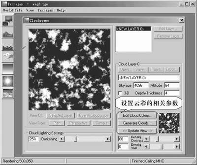 对于云彩和大气层的设置,进入相应的窗口后对默认值作一些修改就可以了,在“Cloudscape(云)”窗口(图4)设置云朵的密度、明暗、颜色等,在“Atmosphere(大气层)”窗口修改雾层稀疏、大气层以及天空的颜色等,朋友们可以自行探索一下即可。