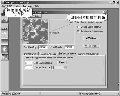 在“Lighting conditions(照明条件)”子窗口(图5),我们将太阳的照射仰角和照射方位做进一步调整,让它们符合我们照片的需要。
