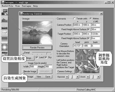 经过以上几个步骤,我们的作品基本有了雏形,接下来我们打开“RenderingControls(着色控制)”窗口(图6),在此窗口里可以进行效果预览,如果不满意的话可以重复进行上面几个步骤修改设置。此窗口还可以调整镜头的方位和视角、照片渲染输出精细度。一般来说,在预览调整的时候,精细度不必太高以免影响速度,最后渲染输出的时候将精细度调至高端即可得到满意的照片。调整照相机方位时,单击鼠标左键确定照相机位置,单击鼠标右键设置被摄目标方位点。