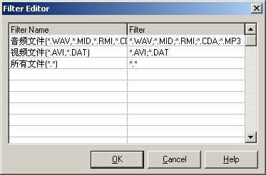 ⑤选择Dialogs组件夹,添加OpenDialog组件,并点击OpenDialog控件的Filter属性右侧按钮,打开“Filter Editor”窗口,建立一个媒体文件过滤Filter(如图6),控制媒体文件(*.wav;*.mid;*.rmi;*.cda;*.mp3;*.avi;*.dat)的格式。