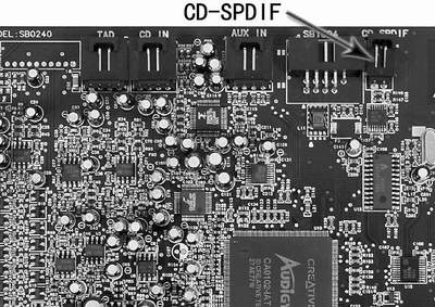 SPDIF接口是近几年才流行的接口,它可以实现数字音频的输入与输出,能显著提高音频播放的质量。SPDIF也有多种形式,目前最常见的是一种叫做“CD SPDIF”的接口,其外观像一个两针插座(图3)。“CD SPDIF”的作用是这样的:CD是数字音乐光盘,以往通过光驱播放CD时,信号是经光驱内部的D/A完成数模转换的,由于光驱采用的D/A芯片质量不高,使得转换后的信号失真很大。而通过这个两针的接口,CD信号就可直接以数字形式传输到声卡上,最后由声卡来完成数模转换,如此一来,CD播放的音质大幅度提升了。