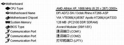 既然是B0核心的AthlonXP 1700+,当然要试试它的超频性能。B0核心的AthlonXP 1700+未锁倍频,所以可通过支持倍频破解的主板调节。将倍频设置为12.5×后开机,自检显示为Unkown CPU Type 1664MHz(相当于AthlonXP 2000+),运行AIDA32检测结果如图所示。