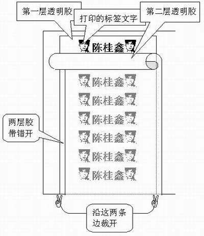 3.在打印好的标签字上面再贴上一层透明胶,这层要与下一层透明胶错开一些以便将来撕下来使用,详见示意图(图1)。