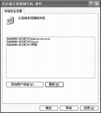 双击“从远端系统强制关机”项,在弹出的属性对话框中,将所有拥有此项操作权限的用户选中,点击“删除”按钮即可消除这个潜在的安全隐患(图3)。