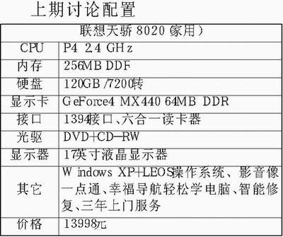 无招胜有招(浙江参赛剑客):这款联想天骄8020是联想推出的一款数字化家用电脑。采用P4 2.4GHz+256MB DDR内存+Windows XP保证了系统性能的稳定性。GeForce4 MX440(64MB DDR)的显卡配以256MB的内存,足以应付绝大多数的应用软件和游戏软件。该机使用的120GB/7200转的硬盘可谓海量,加上现在越来越普及的宽带网络可以大量地从网络上下载软件和视频节目,可不用担心硬盘的容量不够。作为一款定位于数字化的家用电脑,配IEEE1394和六合一读写卡,是很明智的。这样可以很方便地和DV、DC连接,读取其中的图像和视频,还可使用配置的CD-RW将自己所拍摄的视频和照片刻录为光盘。17英寸液晶显示器,不仅有较大的可视面积,而且液晶显示器零辐射的优点对于越来越重视环保的人们是很有吸引力的。我个人认为采用DVD+CD-RW的配置不如使用Combo,毕竟Combo不仅有两者的功能而且价格比两者价格之和要便宜。这款联想天骄8020作为一款定位于数字化的家用电脑是相当出色的,它所具有的Leos系统可以直接播放硬盘上的视频节目和音乐,这些都是很人性化的设计,方便了用户。不过13998元的价格可确实不低。
