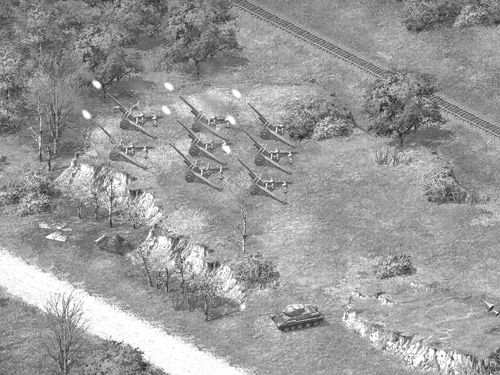 对于接触过《突袭》的玩家,在《闪电战》中将会倍感亲切。由于游戏沿用了《突袭》改良引擎制作,各种爆炸光影,天气效果,自然风光都给你带来耳目一新的感觉。至于大家关心的武器单位,《闪电战》已经超出了游戏本身范畴,为了原汁原味地再现那段历史,模型都由专业人员协助Nival制作,总共会出现250多种历史上的坦克、飞机、大炮等模型。如此多的武器单位,映射出的是盟军、苏联、德国三方阵营。你能自由扮演其中一方,在非洲沙漠、俄罗斯的冰天雪地、西伯利亚大草原体验战火纷飞的世界。当然,忠于历史的设计总会留下败笔。“任务模式”只能遵照历史步伐前进,没有自由空间留给玩家。也就是说,巴巴罗萨计划中苏联必败,德国最终注定投降的命运。对比来看,“挑战模式”才是普通玩家的首选。