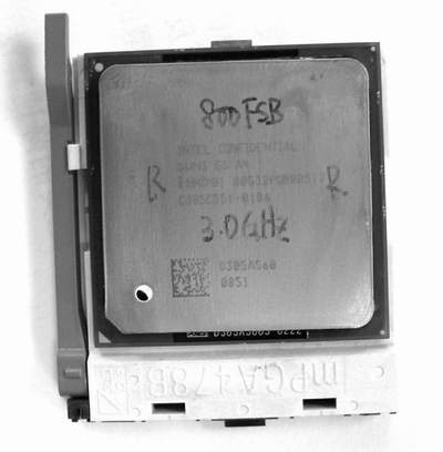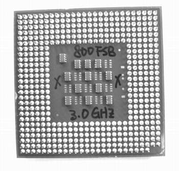 图2是这块工程样品P4处理器的背面,可以看到,除了排电容的位置不同外,排电容的数量和Northwood核心的P4是相同的。