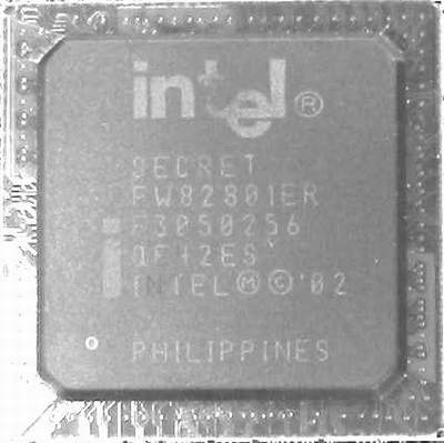 图4是尚在“保密”中的ICH-5南桥芯片,这从图中的SECRET字样就可以看出来。具体型号是FW82801ER。除了ICH-4的全部功能外,还可以直接支持两个S-ATA接口。其实ICH-5还可以通过专门的软件实现软Raid系统的搭建。