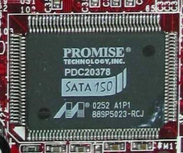 除了通过ICH-5支持S-ATA外,微星这块i865主板上还单独搭载了一块PROMISE的S-ATA/Raid控制芯片(图5),可以支持额外的两个S-ATA接口和一个IDE接口(图1中黄色的IDE口),所以在这块主板上一共可以支持4个S-ATA设备和6个P-ATA设备。
