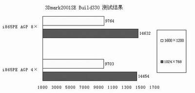 AGP性能一直是Intel芯片组的强项,i865PE也不例外,在双通道DDR400高达4.4GB/s的实测内存带宽支持下,AGP 8×接口得到足够的内存带宽。在游戏测试中我们就可以看到,使用双通道DDR400的i865PE搭配Radeon9700可以让Quake3的DEMO1运行在333FPS的高速度下,而根据我们以前的测试,如果使用单通道DDR266的话,得分会减少8%左右,也就是减少30FPS左右。