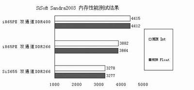 内存性能是i865PE值得骄傲的地方。即便是使用双通道DDR266的模式,仍然能够得到3.8GB左右的内存带宽,这比SiS655还要高一点。而在DDR400模式下,可以提供4.4GB的内存带宽,这已经是目前在不超频的情况下的最高内存得分了,看来SiS655FX出来后,也许和它有得一比。在内存性能方面,i865PE的确无可挑剔,不过另一方面,追求高内存性能的i865PE的内存搭配灵活性就受到了限制,我们发现,用来搭建双通道的内存条必须是同一型号。因为系统会自动侦测内存条的SPD信息,如果发现不相同的话,就会强制使用单通道模式。