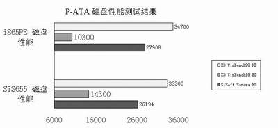 i865PE搭配的ICH-5南桥表现很不错。在SiSoftSandra2003的硬盘测试当中,ICH-5的P-ATA磁盘性能已经超过了在这以前将ICH-4甩在后面的SiS963L南桥,虽然在Winbench99的商业磁盘性能测试中仍然落后SiS963L大约40%,但是在高端磁盘性能中再次超过了SiS963L。可以说,ICH-5的磁盘性能和强大的SiS963L是在一个水平线上,两者平分秋色。在图16的S-ATA测试当中,ICH-5的表现与Promise芯片相当接近,而后者是一款比较成熟的S-ATA控制芯片了,所以作为一款新的南桥芯片,ICH-5的表现算很不错了。同时,我们也领略了这块Maxtor Diamond Plus 9 160GB串行ATA硬盘的实力。在高端磁盘性能测试中,它相对传统P-ATA硬盘的性能得分提高了50%左右,在SiSoftSandra中,得分也提高了30%,可见S-ATA的实力非常强大。当然,硬盘上高达8MB的缓存也功不可没。