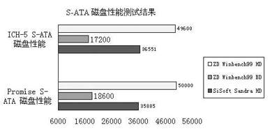 由于ICH-5南桥提供了对S-ATA的支持,并且主板上同时还提供了PROMISE的S-ATA控制芯片,所以我们除了常规的P-ATA磁盘性能测试外,还针对这两块控制芯片进行了S-ATA磁盘性能的测试,以做比较(测试使用Maxtor 160GB S-ATA硬盘)。