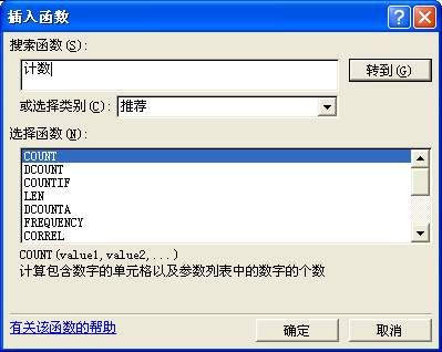 执行“插入→函数”命令,打开“插入函数”对话框(图6),在“搜索函数”下面的方框中输入要求(如“计数”),然后单击“转到”按钮,系统即刻将与“计数”有关的函数挑选出来,并显示在“选择函数”下面的列表框中。再结合查看相关的帮助文件,即可快速确定所需要的函数。