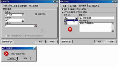 例如我们将光标定位到一个登记“年份”的单元格中,为了输入的统一和计算的方便,我们希望“年份”都用一个四位数来表示。所以,我们可以单击“数据”菜单的“有效性”选项。在“设置”卡片“有效性条件”的“允许”下拉菜单中选择“文本长度”。然后在“数据”下拉菜单中选择“等于”,且“长度”为“4”。同时,我们再来到“出错警告”卡片中,将“输入无效数据时显示的出错警告”设为“停止”,并在“标题”和“错误信息”栏中分别填入“输入文本非法!”和“请输入四位数年份。”字样。