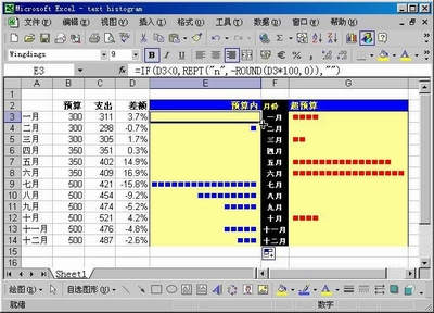 比如我们首先制作一张年度收支平衡表,然后将“E列”作为直方图中“预算内”月份的显示区,将“G列”则作为直方图中“超预算”的显示区。然后根据表中已有结果“D列”的数值,用“Wingdings”字体的“N”字符表现出来。具体步骤如下: