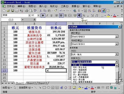 完成后我们再次打开“工具”菜单,单击“欧元转换”,一个独立的专门用于欧元和欧盟成员国货币转换的窗口就出现了(图16)。与Excel的其他函数窗口一样,我们可以通过鼠标设置货币转换的“源区域”和“目标区域”,然后再选择转换前后的不同币种即可。如图16所示的就是“100欧元”分别转换成欧盟成员国其他货币的比价一览表。当然,为了使欧元的显示更显专业,我们还可以点击Excel工具栏上的“欧元”按钮,这样所有转换后的货币数值都是欧元的样式了。