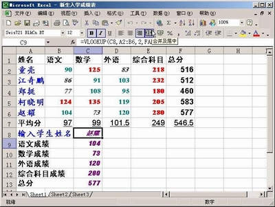 接下来,我们就来检验“VLOOKUP”函数的功效。试着在“C8”单元格中输入某个学生名,比如“赵耀”,回车之下我们会发现,其下方每一科目的单元格中就自动显示出该生的入学成绩了。