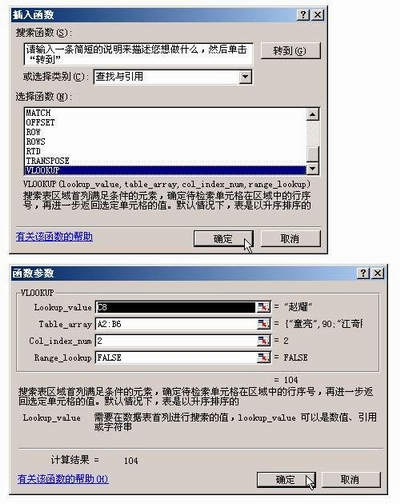 将光标定位到C9单元格中,然后单击“插入”之“函数”选项。在如图18弹出的窗口中,选择“VLOOKUP”函数,点“确定”。在随即弹出的“函数参数”窗口中我们设置“Lookup_value”(指需要在数据表首列中搜索的值)为“C8”(即搜索我们在C8单元格中填入的人名);“Table_array”(指数据搜索的范围)为“A2:B6”(即在所有学生的“语文”成绩中搜索);“Col_vindex_num”(指要搜索的数值在表格中的序列号)为“2”(即数值在第2列);“Range_lookup”(指是否需要精确匹配)为“FALSE”(表明不是。如果是,就为“TURE”)。设定完毕按“确定”。
