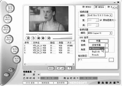 DVDrip的以上这些问题很大的一部分是字幕造成的,也有人尝试过不使用外挂字幕,而将字幕内镶至视频中,这样欣赏时可以减少很多麻烦,《豪杰视频转换》(下载地址:http://www.herosoft.com/share/hvc2.exe)便是这样一款软件,它能将DVD的字幕流内镶在视频中,使制作带字幕的高质量DVDrip变得非常容易。