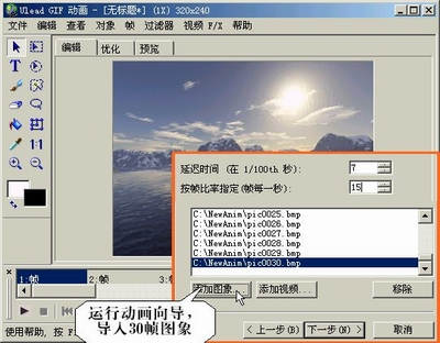 动画帧制作完成了。下面采用第三方工具将它合成为影片就行了。合成工具很多,我们采用的是友立公司的Ulead GIF Animator 5来完成这项工作。启动后调出“动画向导”(图2),将影片尺寸设置为与动画帧相同的320×240大小,帧比率设置为每秒15帧,导入后进行图像优化,最后执行主菜单“文件→另存为→Macromedia Flash(swf)文件→使用JPEG”。这样就生成了一段30帧的Flash格式的视频影片,体积655Kb。打开播放器看一看,画面中镜头的推移感使雪山迅速拉到眼前,获得了很不错的效果。
