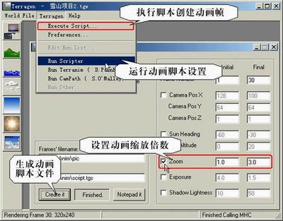 打开主菜单“Terragen→run scripter”选项,就会弹出相应的子窗口(图1),这就是动画脚本生成窗口。我们需要在C盘建立一个“Newanim”的子目录(软件默认目录,也可更改为其他目录)。