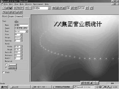 图表总得有个标题吧,单击工具栏上的按钮,会弹出一个文字输入框,在其中填入要显示的标题文字,并选择一下字体(建议再修改一下标志名称),最后单击“OK”按钮,这时在工作区内便可看到转换为3D的文字了。