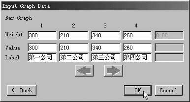 3)最后一步是输入具体的数据(图2)。在“Height”栏中是定义各项的高度,“Velue”栏是输入各项的值;最下面的“Label”则是各项的名称;输入完后单击“OK”按钮,看看生成的表还不错吧!