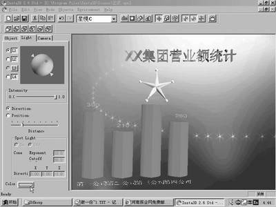 2)导入的模型同样可以像文字一样变换表面的材质。不过有时模型会略显干白灰暗,我们可以切换编辑选择区到“Light”(灯光)窗口,见图3,这里可以为模型点缀上灯光效果,灯光的颜色还可以自己定义!