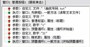 先确定要用到的构件:“随机数”构件(在“控制件”中可以找到):用于产生随机数以便抽取文本文件的行号;“列表框”构件(在“选择件”中可以找到):用于操作预先建立的文本文件;“预置循环”构件(在“控制件“中可以找到):因为每个号码的产生过程都是一样的,共需要7次,所以用它可以减少重复性劳动;“普通标签”构件(在“文本件”中可以找到):用于显示最终模拟摇奖结果;“普通按钮”构件(在“按钮件”中可以找到):用于当鼠标单击它的时候,产生幸运号码。只须预置循环构件的循环开始值属性为“1”,循环结束值属性为“7”。