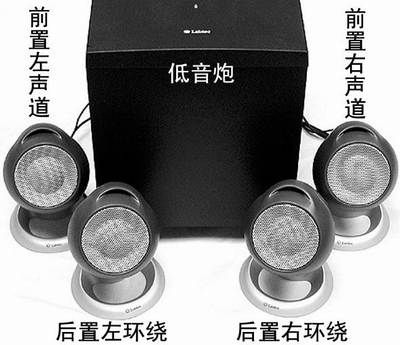 4.1音箱中的两个主音箱一般摆放在显示器的两边,因此又称为“前置左声道”音箱和“前置右声道”音箱,而低音炮一般摆放在显示器的下面,至于环绕音箱,因为它们摆放在听众的身边,因此又叫“后置左环绕”音箱和“后置右环绕”音箱(图4)。